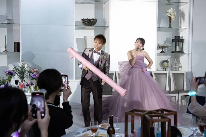 披露宴では、LIVEを感じさせる音と光の演出「シンクロライト」を取り入れ、ゲストのペンライトが音楽に連動して光る、まるでフェスのような一体感を演出。